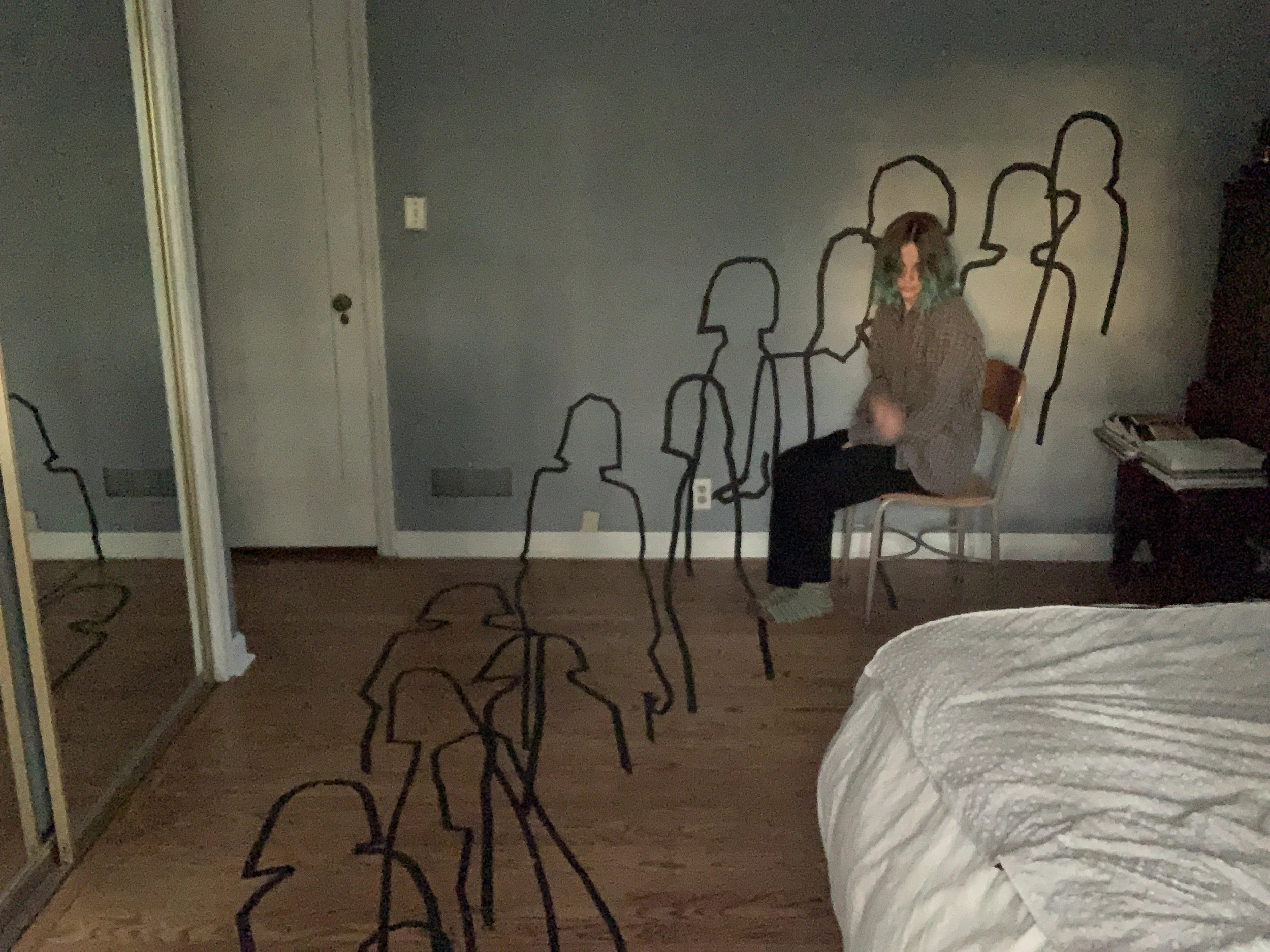 Time Stamps developed at the start of the COVID-19 pandemic shutdown as a way of documenting the trace of a body in a room as well as time spent in a room over a two week quarantine period. I utilized afternoon light to trace the shadow of my body onto the floors and walls of my bedroom every day for two weeks. I preserved these marks with masking tape, creating a trajectory of accumulated silhouettes. I became interested in the ways in which our shared experience of mandated solitude impacts our individual well being during a global pandemic.