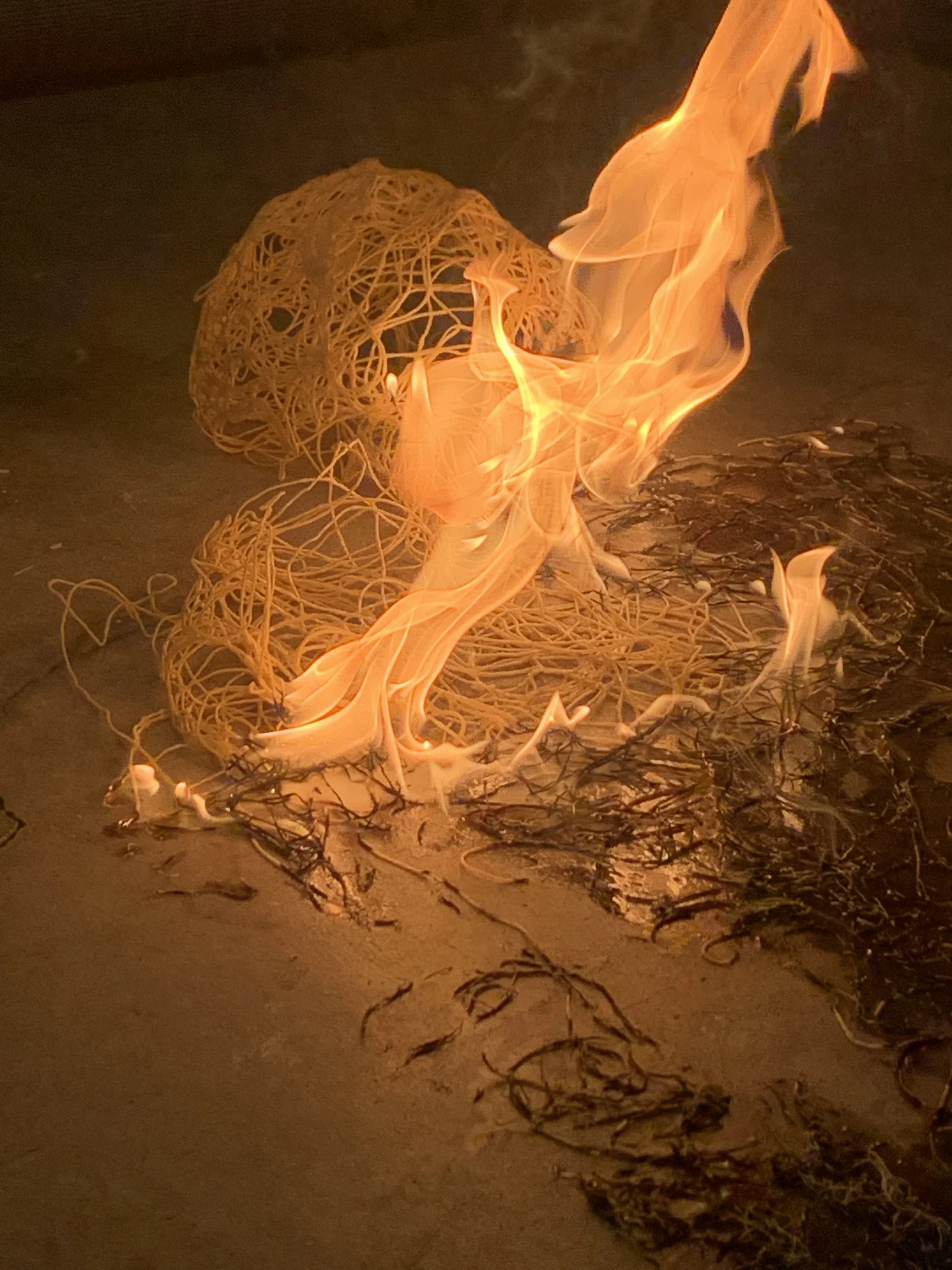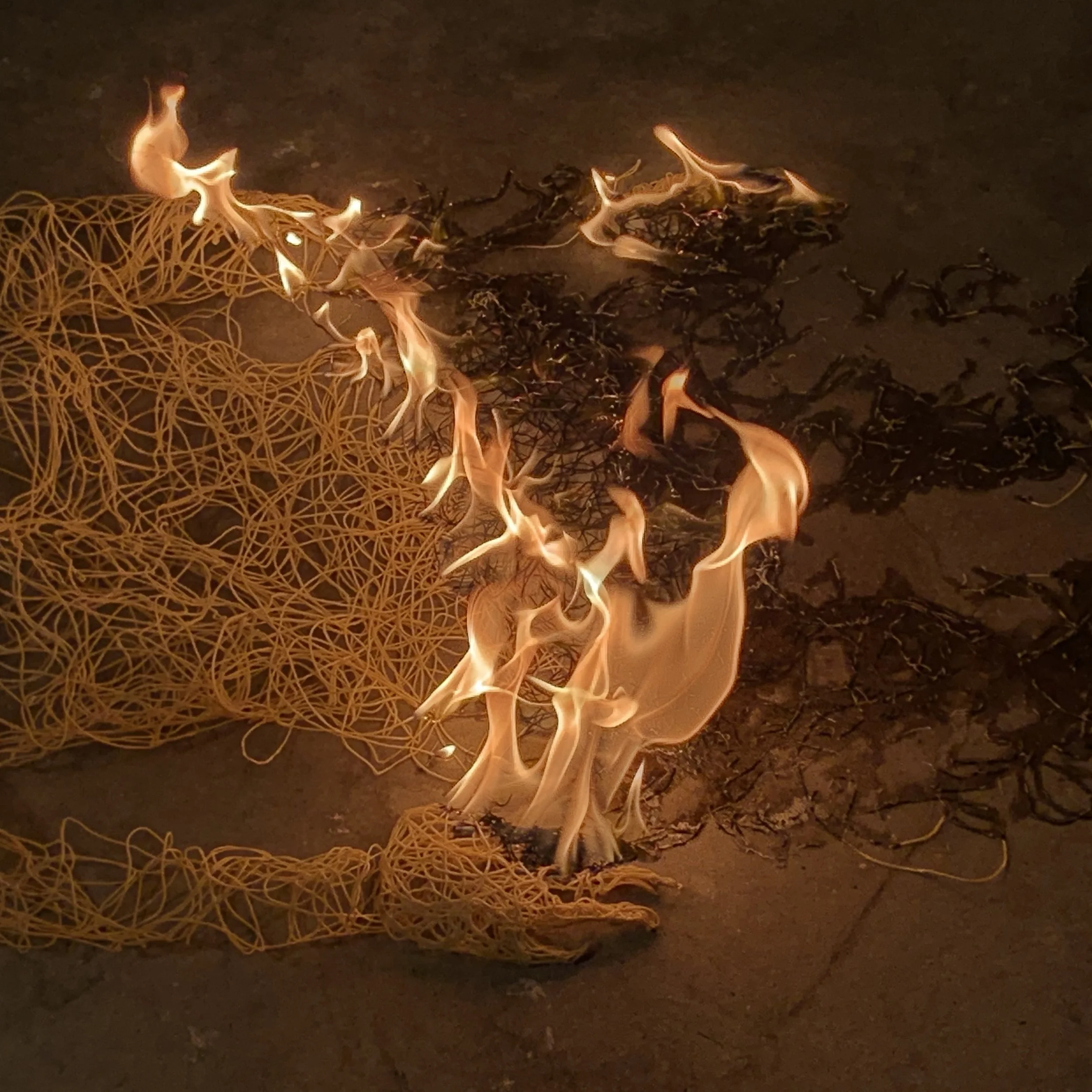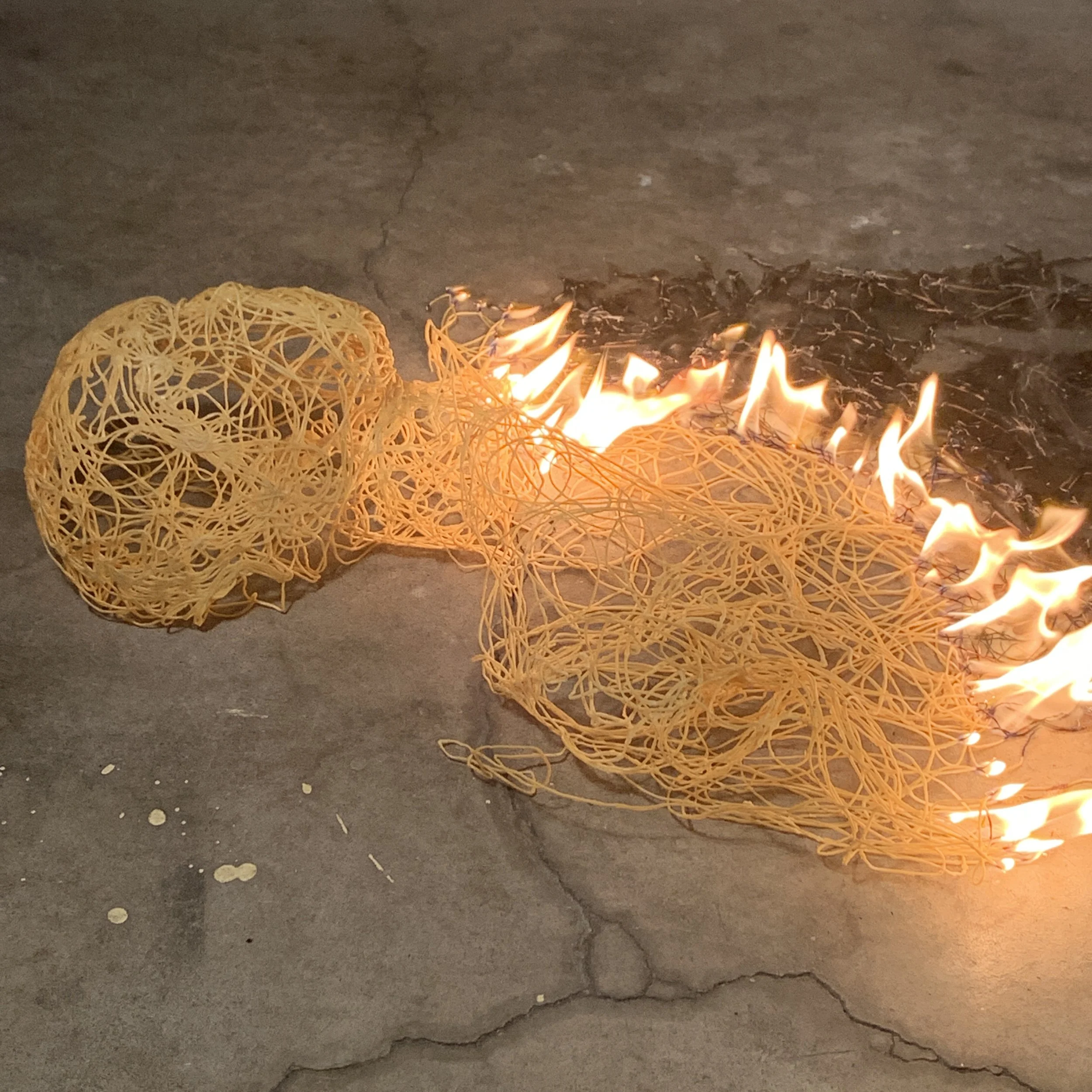Untitled (Burning Body) originated as a mold of my body made of beeswax coated hemp wire that would act as a flammable material that could then be extinguished by my own hand. I filmed this process of burning in a single aerial view camera frame that plays on a projected loop within the gallery space. At the time, this work enabled a shift in authorship, a liberation from past selves marking the beginning of an investigation into gradations between the automatic as well as a reclaiming of my own personal autonomy. When creating this work, I was interested in the role of documentation and my own surrendering to both time and the material. After the burning of the mold, the piece no longer existed in physical space but rather in the form of video. The body, although it is mine, can serve as a stand-in body for that of the viewer and as well as a collective body that is in need of care.